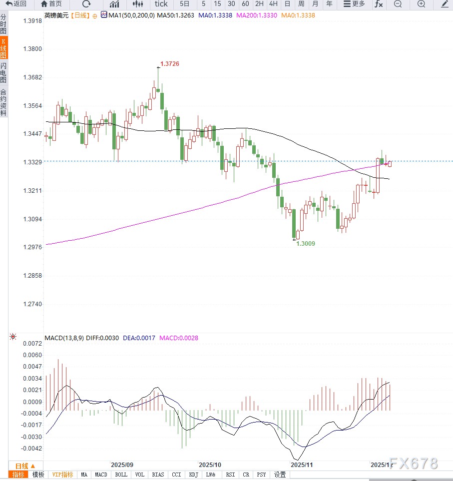 汇通财经APP讯——英镑兑美元在新周开盘呈现温和整理态势,在1.3320附近窄幅波动亨利投资,但仍仅略低于上周触及的自10月22日以来高点。多头重点关注能否有效站上100日简单移动均线,为下一阶段上行提供确认信号。